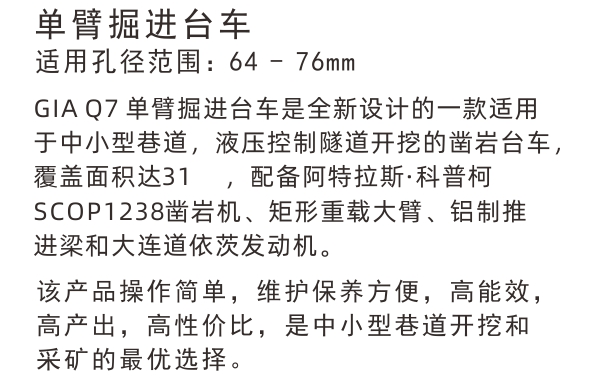 GIA Q7 單臂掘進臺車是全新設(shè)計的一款適用于中小型巷道,液壓控制隧道開挖的鑿巖臺車,覆蓋面積達31 ,配備阿特拉斯·科普柯SCOP1238鑿巖機、矩形重載大臂、鋁制推進梁和大連道依茨發(fā)動機。該產(chǎn)品操作簡單,維護保養(yǎng)方便,高能效,高產(chǎn)出,高性價比,是中小型巷道開挖和采礦的最優(yōu)選擇。